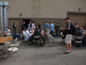 On Sunday morning I got up and headed over to Gangplank which is an absolutely awesome co-working space. Our friend Abbie Sanderson was teaching a class called WordPress for Kids to a group of about a dozen kids that looked like they ranged in age from 8 to 13. It was a really unique event and I'm glad I had a chance to see it in action. Just before lunch, the kids headed home and a couple dozen WordPress developers took the place over. It started off with a BBQ in the back alley and some chit-chat. After everybody was finished we all took seats back inside.