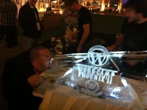 The official after party was a blast. page.ly brought in a photo booth where they took Red Carpet photos as people showed up and costumed tomfoolery photos after the alcohol had been flowing for a bit. There was some yummy tap beer from Four Peaks Brewery and some tasty food from Famous Dave's BBQ. And, to make sure this WordCamp wouldn't be outdone by any WordCamp any time soon, they had a bad ass WordPress ice sculpture / alcohol luge. Jager anyone?